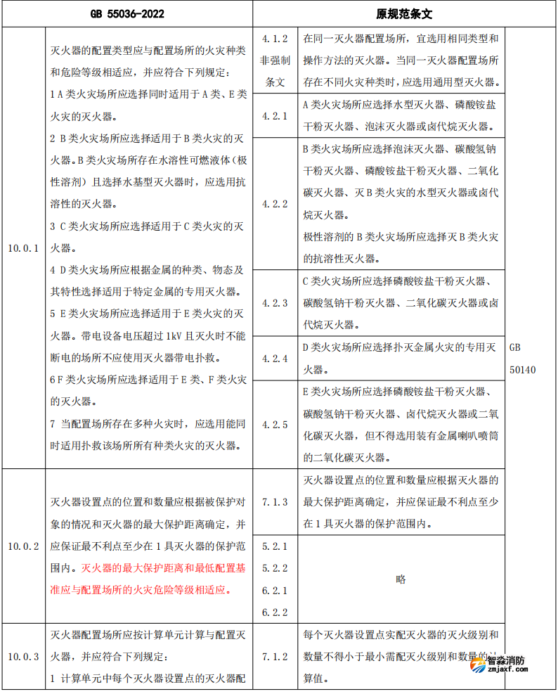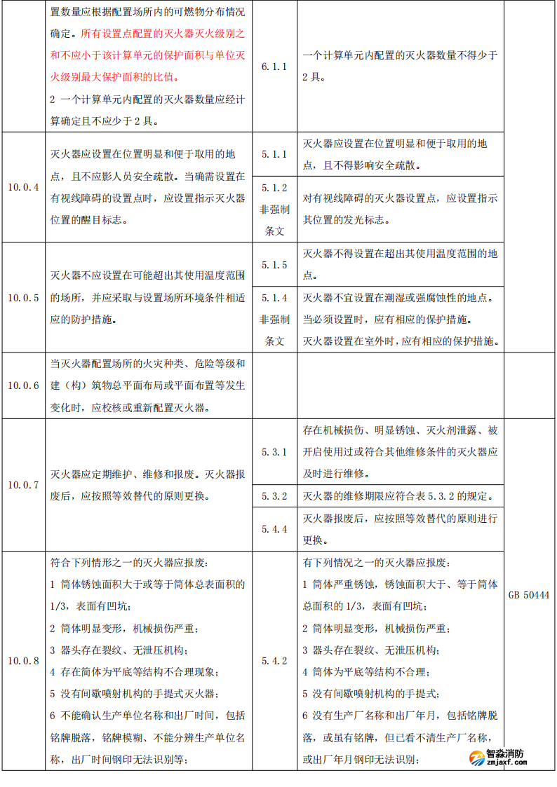 10.0.1 滅火器的配置類型應(yīng)與配置場(chǎng)所的火災(zāi)種類和危險(xiǎn)等級(jí)相適應(yīng),并應(yīng)符合下列規(guī)定:1 A類火災(zāi)場(chǎng)所應(yīng)選擇同時(shí)適用于A類、E類火災(zāi)的滅火器。2 B類火災(zāi)場(chǎng)所應(yīng)選擇適用于B類火災(zāi)的滅火器。B類火災(zāi)場(chǎng)所存在水溶性可燃液體(極性溶劑)且選擇水基型滅火器時(shí),應(yīng)選用抗溶性的滅火器。3 C類火災(zāi)場(chǎng)所應(yīng)選擇適用于C類火災(zāi)的滅火器。4 D類火災(zāi)場(chǎng)所應(yīng)根據(jù)金屬的種類、物態(tài)及其特性選擇適用于特定金屬的專用滅火器。5 E類火災(zāi)場(chǎng)所應(yīng)選擇適用于E類火災(zāi)的滅火器。帶電設(shè)備電壓超過(guò)1kV且滅火時(shí)不能斷電的場(chǎng)所不應(yīng)使用滅火器帶電撲救。6 F類火災(zāi)場(chǎng)所應(yīng)選擇適用于E類、F類火災(zāi)的滅火器。7 當(dāng)配置場(chǎng)所存在多種火災(zāi)時(shí),應(yīng)選用能同時(shí)適用撲救該場(chǎng)所所有種類火災(zāi)的滅火器。10.0.2 滅火器設(shè)置點(diǎn)的位置和數(shù)量應(yīng)根據(jù)被保護(hù)對(duì)象的情況和滅火器的最大保護(hù)距離確定,并應(yīng)保證最不利點(diǎn)至少在1具滅火器的保護(hù)范圍內(nèi)。滅火器的最大保護(hù)距離和最低配置基準(zhǔn)應(yīng)與配置場(chǎng)所的火災(zāi)危險(xiǎn)等級(jí)相適應(yīng)。10.0.3 滅火器配置場(chǎng)所應(yīng)按計(jì)算單元計(jì)算與配置滅火器,并應(yīng)符合下列規(guī)定:1 計(jì)算單元中每個(gè)滅火器設(shè)置點(diǎn)的滅火器配置數(shù)量應(yīng)根據(jù)配置場(chǎng)所內(nèi)的可燃物分布情況確定。所有設(shè)置點(diǎn)配置的滅火器滅火級(jí)別之和不應(yīng)小于該計(jì)算單元的保護(hù)面積與單位滅火級(jí)別最大保護(hù)面積的比值。(作者注:配置計(jì)算方式發(fā)生變化?新規(guī)范生效后滅火器配置計(jì)算更加簡(jiǎn)單?)2 一個(gè)計(jì)算單元內(nèi)配置的滅火器數(shù)量應(yīng)經(jīng)計(jì)算確定且不應(yīng)少于2具。10.0.4 滅火器應(yīng)設(shè)置在位置明顯和便于取用的地點(diǎn),且不應(yīng)影人員安全疏散。當(dāng)確需設(shè)置在有視線障礙的設(shè)置點(diǎn)時(shí),應(yīng)設(shè)置指示滅火器位置的醒目標(biāo)志。10.0.5 滅火器不應(yīng)設(shè)置在可能超出其使用溫度范圍的場(chǎng)所,并應(yīng)采取與設(shè)置場(chǎng)所環(huán)境條件相適應(yīng)的防護(hù)措施。10.0.6 當(dāng)滅火器配置場(chǎng)所的火災(zāi)種類、危險(xiǎn)等級(jí)和建(構(gòu))筑物總平面布局或平面布置等發(fā)生變化時(shí),應(yīng)校核或重新配置滅火器。10.0.7 滅火器應(yīng)定期維護(hù)、維修和報(bào)廢。滅火器報(bào)廢后,應(yīng)按照等效替代的原則更換。(作者注:雖然原規(guī)范關(guān)于滅火器維修的年限取消了強(qiáng)制性規(guī)范要求,但仍會(huì)結(jié)合本規(guī)范的相關(guān)強(qiáng)制性條文進(jìn)行執(zhí)行?)10.0.8 符合下列情形之一的滅火器應(yīng)報(bào)廢:1 筒體銹蝕面積大于或等于筒體總表面積的1/3,表面有凹坑;2 筒體明顯變形,機(jī)械損傷嚴(yán)重;3 器頭存在裂紋、無(wú)泄壓機(jī)構(gòu);4 存在筒體為平底等結(jié)構(gòu)不合理現(xiàn)象;5 沒(méi)有間歇噴射機(jī)構(gòu)的手提式滅火器;6 不能確認(rèn)生產(chǎn)單位名稱和出廠時(shí)間,包括銘牌脫落,銘牌模糊、不能分辨生產(chǎn)單位名稱,出廠時(shí)間鋼印無(wú)法識(shí)別等;7 筒體有錫焊、銅焊或補(bǔ)綴等修補(bǔ)痕跡;9 出廠時(shí)間達(dá)到或超過(guò)表10.0.8規(guī)定的最大報(bào)廢期限。