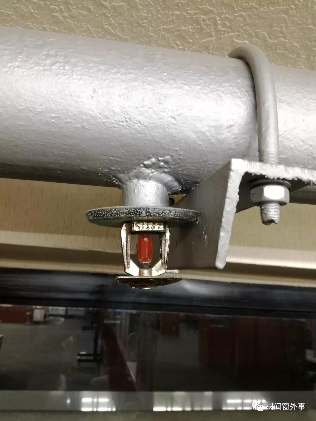 逸夫館二層中文科技圖書借閱區(qū)的消防噴淋系統(tǒng),噴頭用紅色感溫玻璃球控制。