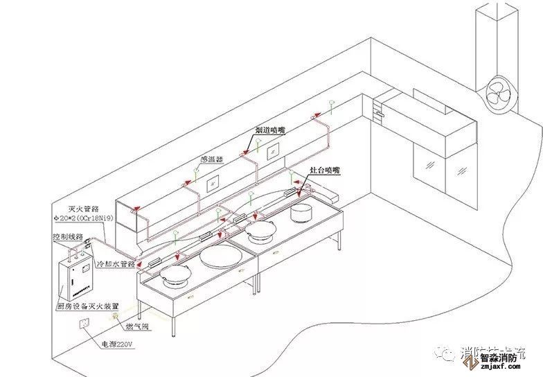 當(dāng)廚房灶臺油鍋內(nèi)的食用油因高溫產(chǎn)生自燃或集油煙罩及排煙管道內(nèi)的油垢遇到火星燃燒,且溫度達(dá)到溫度探測器動作設(shè)定值時,裝置發(fā)出聲光報警,同時關(guān)閉燃料閥、切斷排煙道風(fēng)機(jī)及廚房設(shè)備電源,并輸出火災(zāi)信號。當(dāng)滿足了報瞥聯(lián)動延時的設(shè)定時間后,對著火點噴射細(xì)水霧進(jìn)行滅火,滅火后裝置自動噴灑冷卻水以防止復(fù)燃。同時應(yīng)具有具備自動、手動及機(jī)械應(yīng)急啟動三種啟動方式。