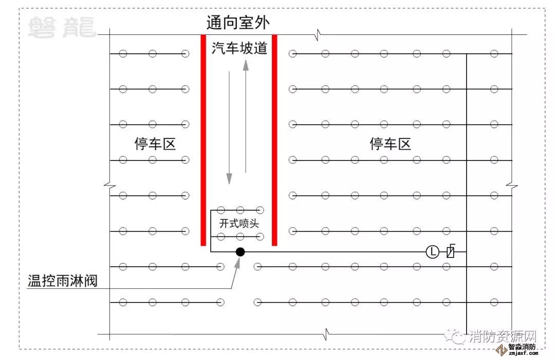 汽車坡道的防火分隔及自動(dòng)滅火設(shè)施,主要是防止火災(zāi)在不同區(qū)域蔓延,通常情況下,汽車坡道的室外出口部位,并不需要設(shè)置防火分隔措施,但是,對(duì)于設(shè)置有自動(dòng)滅火系統(tǒng)的汽車庫,仍應(yīng)將自動(dòng)滅火系統(tǒng)擴(kuò)展到汽車坡道的出口部位。(對(duì)于沒有設(shè)置自動(dòng)滅火系統(tǒng)的汽車庫,不需要設(shè)置防火卷簾和防火門等分隔措施)