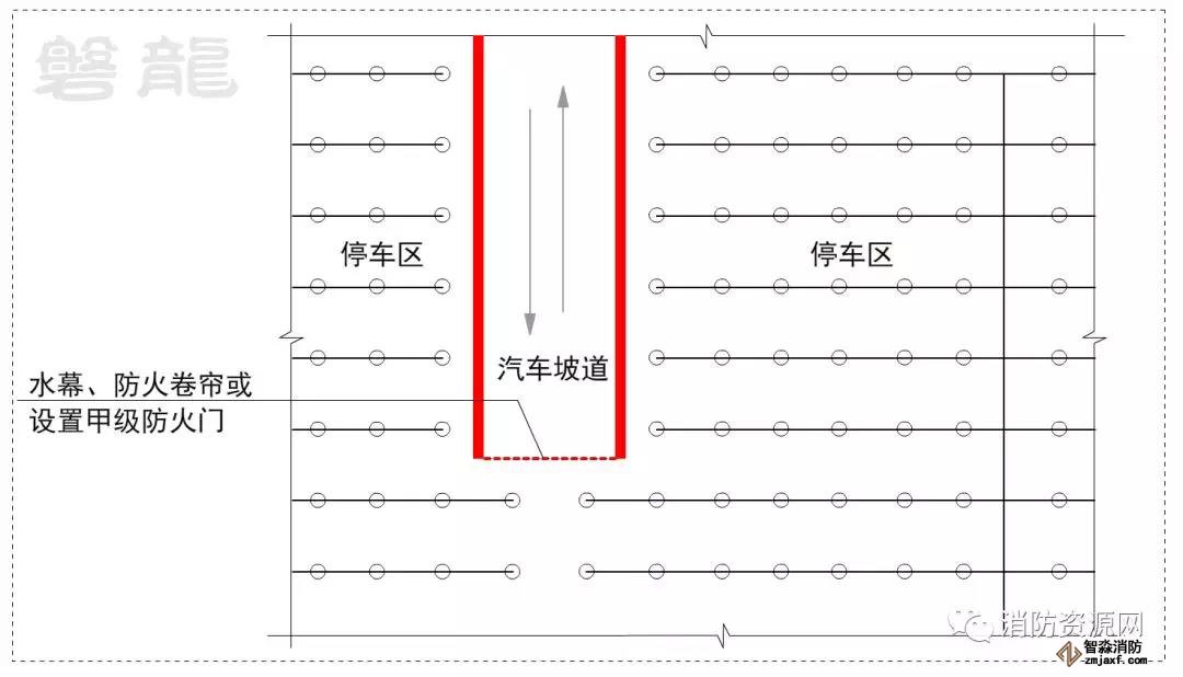 3、綜上,對(duì)于設(shè)置有自動(dòng)滅火系統(tǒng)的汽車庫,通常會(huì)在坡道上方設(shè)置自動(dòng)滅火系統(tǒng)保護(hù),不需要采取防火卷簾或防火門等分隔措施。對(duì)于沒有設(shè)置自動(dòng)滅火系統(tǒng)的汽車庫,通常會(huì)采取防火卷簾、甲級(jí)防火門等作為防火分隔措施。