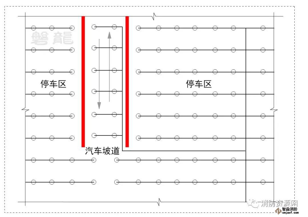 一、對(duì)于需要設(shè)置自動(dòng)滅火系統(tǒng)保護(hù)的錯(cuò)層式和斜樓板式汽車庫,由于防火分區(qū)較難分隔,停車區(qū)與車道之間也難分隔,車道、坡道上方均應(yīng)設(shè)置灑水噴頭保護(hù)。