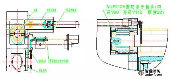 本方案中,突出的關(guān)鍵技術(shù)一是剛性芯軸通過(guò)兩個(gè)NUP21E軸承的巧妙布置后的懸置固定,徹底解決了剛性芯軸在筒體卷制過(guò)程中瞬間偏轉(zhuǎn)而使剛性芯軸提前失效最終導(dǎo)致設(shè)備無(wú)法正常卷制的致命技術(shù)問(wèn)題。