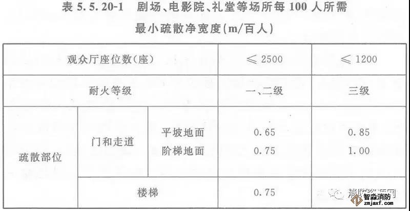 2、劇場(chǎng)、電影院、禮堂等場(chǎng)所供觀眾疏散的所有內(nèi)門、外門、樓梯和走道的各自總凈寬度,應(yīng)根據(jù)疏散人數(shù)按每100人的最小疏散凈寬度不小于表5.5.20-1的規(guī)定計(jì)算確定;