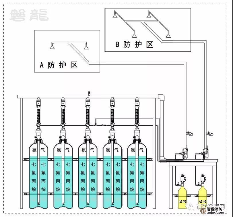 在外貯壓式的七氟丙烷系統(tǒng)中,高壓氮?dú)赓A存在動(dòng)力瓶組中;七氟丙烷藥劑貯存在藥劑瓶組中。當(dāng)系統(tǒng)啟動(dòng)時(shí),動(dòng)力瓶組中的高壓氮?dú)饨?jīng)減壓閥釋放至藥劑瓶組,推動(dòng)七氟丙烷滅火劑釋放至防護(hù)區(qū)。
