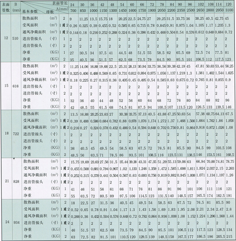 U型蒸汽散熱器有各種不同表面管長、管數(shù)、排數(shù)及翅片片距的多種配合,計(jì)有大小規(guī)格七百六十五種。