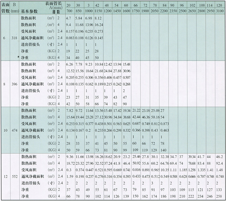 型號(hào)-排數(shù)-表面管數(shù)-表面管長(zhǎng)(英寸)。